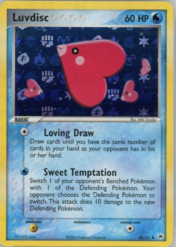 The Luvdisc 2004 EX: Hidden Legends #040/101 Reverse Holo card in Raw TCG (Near Mint) condition has moved up $1.99 (+33.2%) in the last 30 days and was last sold for $7.99 .