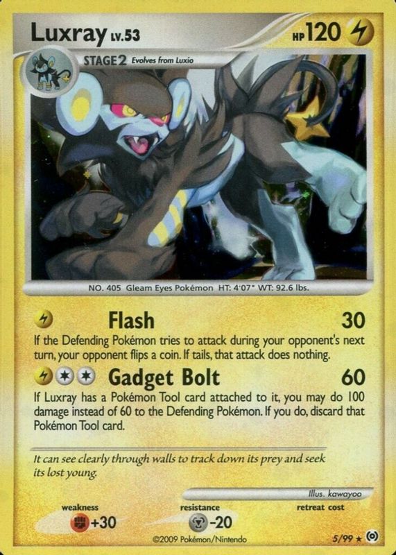 The Luxray 2009 Platinum: Arceus #05/99 Holo card in Raw TCG (Near Mint) condition has moved up $2.50 (+50.1%) in the last 30 days and was last sold for $7.49 .