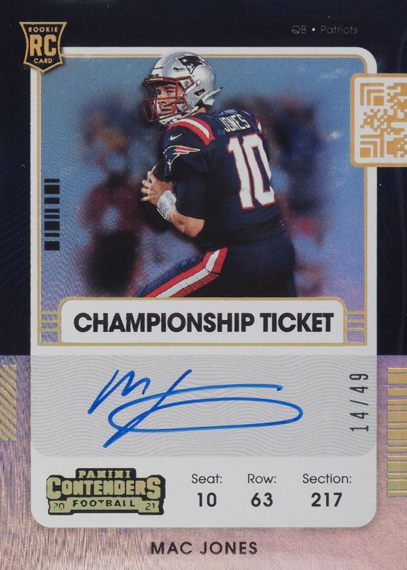 The Mac Jones 2021 Contenders #109 Rookie Ticket Auto - Championship Ticket /49 card in Raw condition has not changed in price in the last 30 days and was last sold for $280.00 .