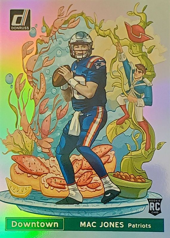The Mac Jones 2021 Donruss #DT-40 Downtown /(SSP) Rookie card in Raw condition has moved down -$124 (-41.2%) in the last 30 days and was last sold for $176.50 .