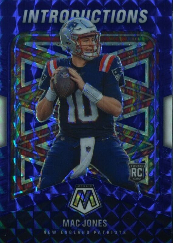 The Mac Jones 2021 Mosaic #I-5 Introductions - Blue /99 Rookie card in Raw condition has not changed in price in the last 30 days and was last sold for $5.00 .