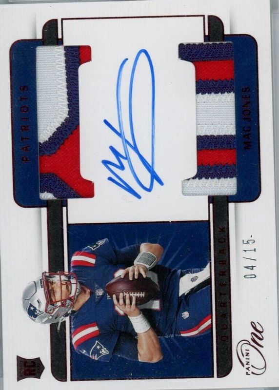 The Mac Jones 2021 One #36 Rookie Dual Patch Auto - Red (/15) card in Raw condition has not changed in price in the last 30 days and was last sold for $500.00 .