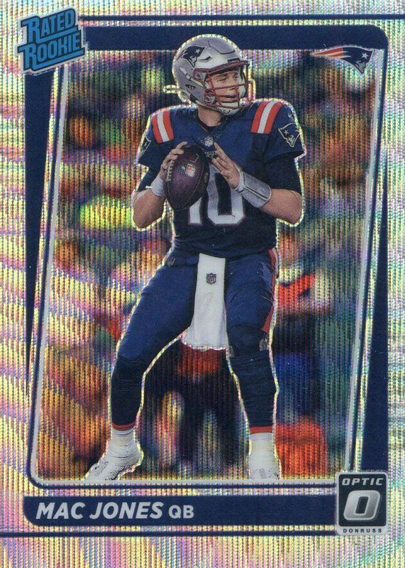 The Mac Jones 2021 Optic #206 Wave /299 Rookie card in Raw condition has not changed in price in the last 30 days and was last sold for $12.50 .