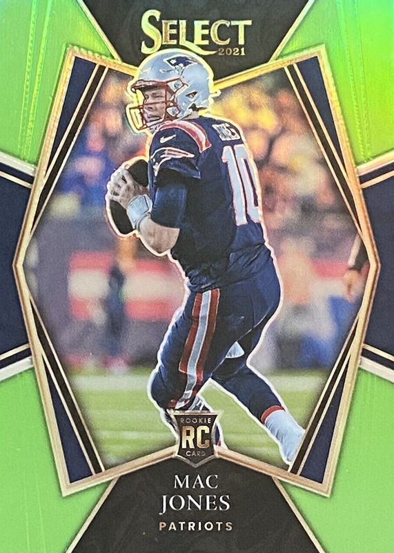The Mac Jones 2021 Select #151 Premier Level Neon Green /49 Rookie card in Raw condition has not changed in price in the last 30 days and was last sold for $2.25 .