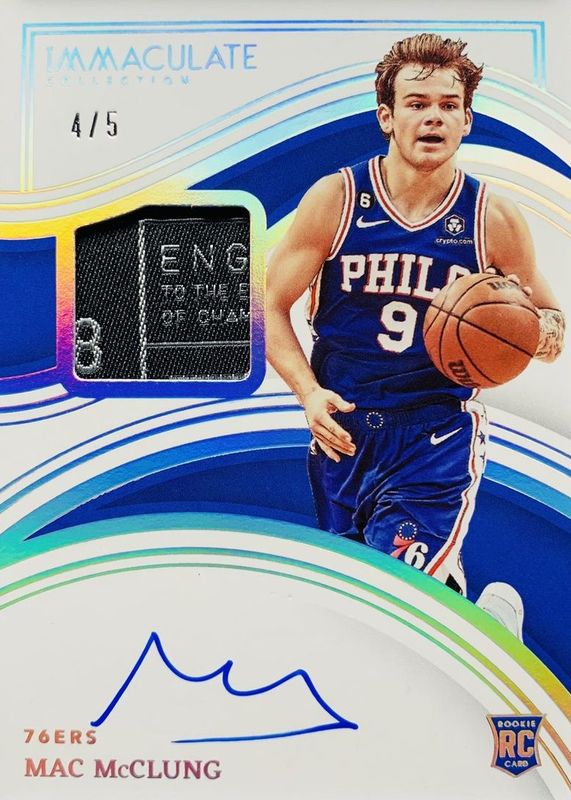 The Mac McClung 2022 Immaculate #115 Rookie Patch Auto - Tag /5 card in Raw condition has not changed in price in the last 30 days and was last sold for $179.99 .