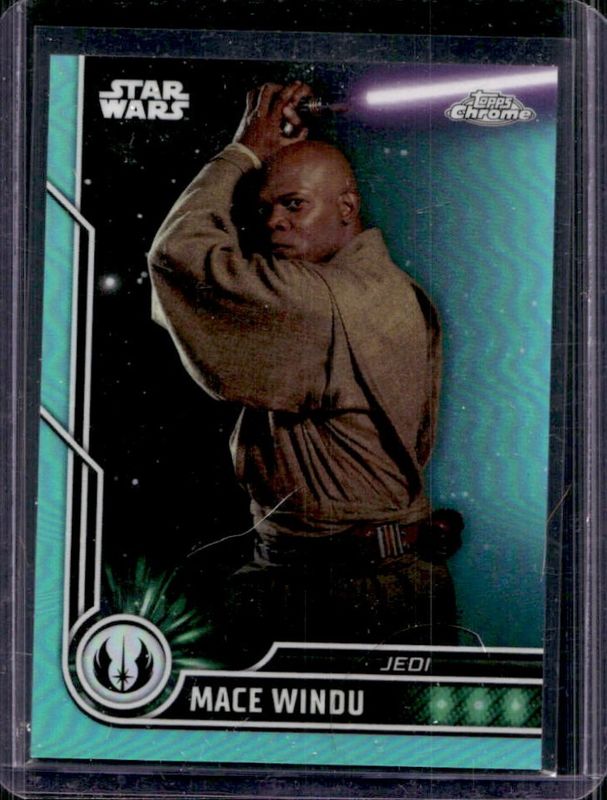 The Mace Windu 2023 Topps Chrome Star Wars #43 Aqua /199 card is 1 of 12 Mace Windu's card variations in the 2023 Topps Chrome Star Wars set being tracked by Sports Card Investor, including Base, Black Wave, Purple Wave, Refractor, and Blue /150.