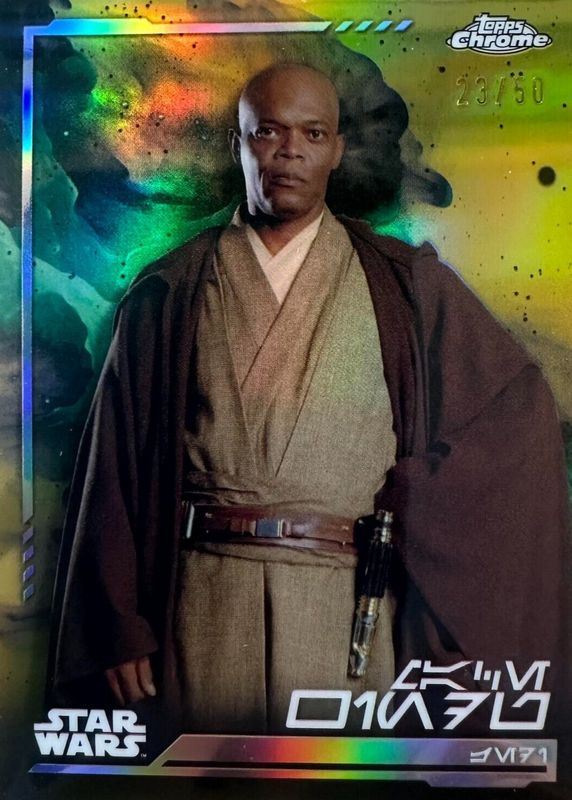 Best Prices Available For Sale of Mace Windu 2024 Topps Chrome Star Wars #AV-138 Aurebesh Variation - Gold Refractor /50