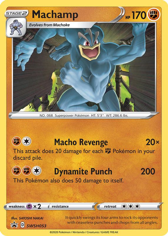 The Machamp 2020 Sword & Shield: Black Star Promo #SWSH053 Champion's Path Special Pin Collection card in Raw TCG (Near Mint) condition has moved down -$0.16 (-9.9%) in the last 30 days and was last sold for $1.45 .