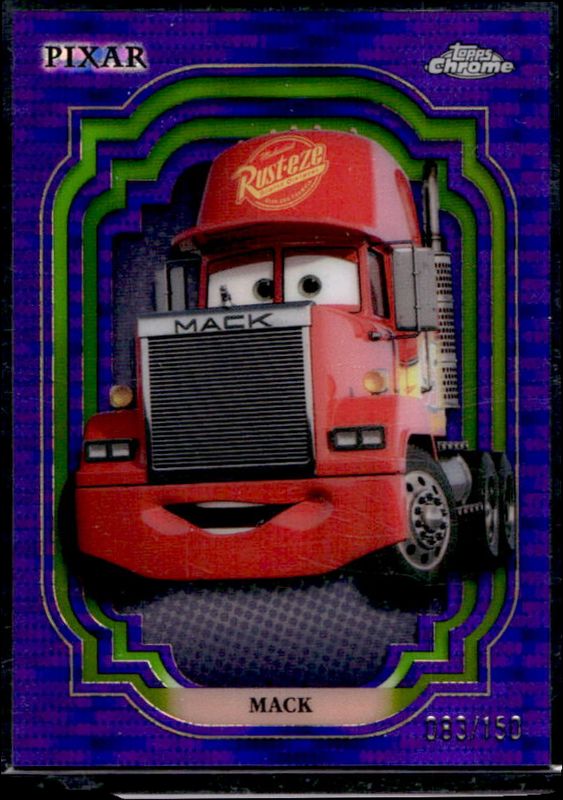 The Mack 2024 Topps Chrome Disney #121 Purple & Green Pulsar /150 card is 1 of 15 Mack's card variations in the 2024 Topps Chrome Disney set being tracked by Sports Card Investor, including Base, Refractor, Purple Refractor /199, Black & White Speckle /101, and Green Refractor /99.