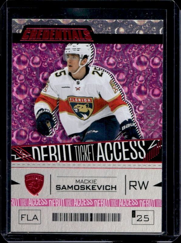 The Mackie Samoskevich 2023 Upper Deck Credentials #110 Pink /49 Rookie card is 1 of 20 Mackie Samoskevich's card variations in the 2023 Upper Deck Credentials set being tracked by Sports Card Investor, including Base /999, Debut Ticket Access Horizontal Variation Yellow, Yellow, Debut Ticket Access Horizontal Variation /799, and Red /349.