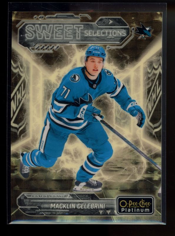 The Macklin Celebrini 2024 O-Pee-Chee Platinum #SS-11 Sweet Selections - Golden Treasures /1 Rookie card is 1 of 45 Macklin Celebrini's card variations in the 2024 O-Pee-Chee Platinum set being tracked by Sports Card Investor, including Base, Neon Yellow Surge, Pink Magma, Rainbow, and Sunset.