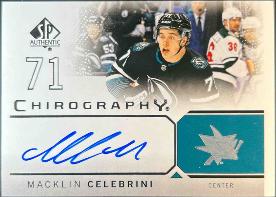 The Macklin Celebrini 2024 SP Authentic #C-MC Chirography Rookie card is 1 of 31 Macklin Celebrini's card variations in the 2024 SP Authentic set being tracked by Sports Card Investor, including Base /999, Auto Mystery Black, Limited Red, Limited Blue /399, and Future Watch Horizontal /199.