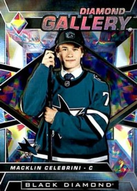 The Macklin Celebrini 2024 Upper Deck Black Diamond #DG-MC Diamond Gallery Rookie card is 1 of 61 Macklin Celebrini's card variations in the 2024 Upper Deck Black Diamond set being tracked by Sports Card Investor, including Base /349, Diamond Relic Rookies /99, Premium Relics /50, Autographs /49, and Diamond Relic Rookies Emerald /10.