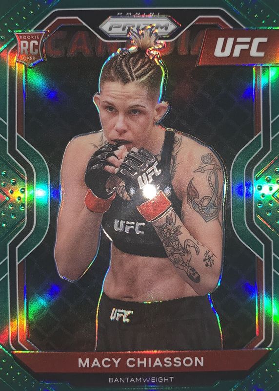 The Macy Chiasson 2021 Prizm UFC #37 Green Rookie card in Raw condition has not changed in price in the last 30 days and was last sold for $1.06 .
