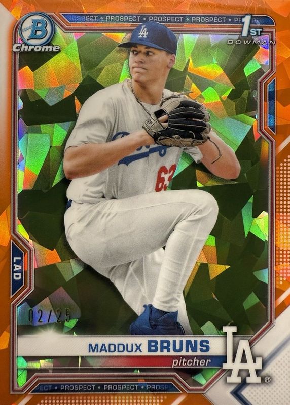 The Maddux Bruns 2021 Bowman Draft Sapphire Edition #BDC-126 Chrome - Orange /25 (1st) card in Raw condition has not changed in price in the last 30 days and was last sold for $3.25 .