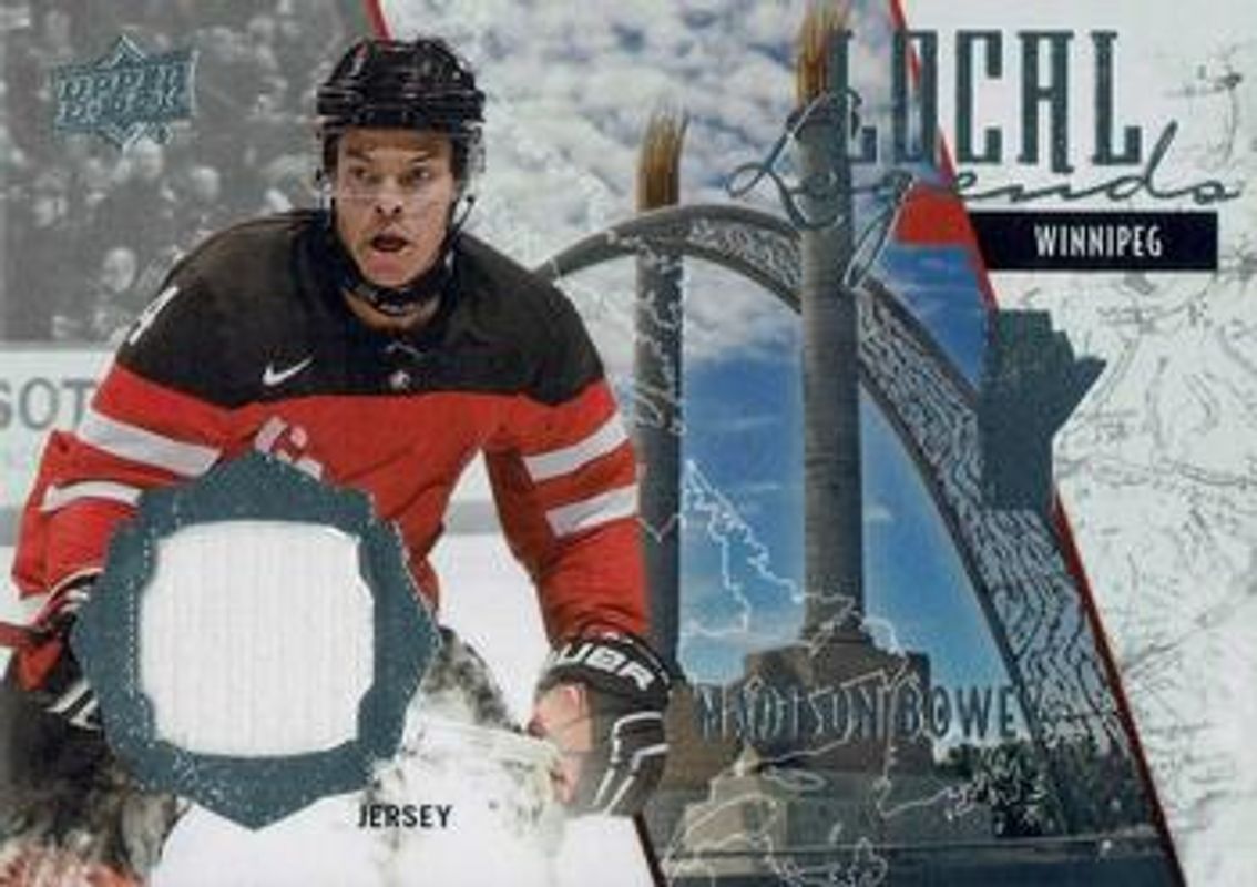 The Madison Bowey 2015 Upper Deck Team Canada Juniors #LL-MB Local Legends card is 1 of 20 Madison Bowey's card variations in the 2015 Upper Deck Team Canada Juniors set being tracked by Sports Card Investor, including Base, Gold, Exclusives /199, High Gloss /25, and Printing Plates Black /1.