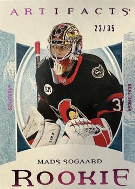 The Mads Sogaard 2022 Upper Deck Artifacts #177 Pink /35 Rookie card is 1 of 19 Mads Sogaard's card variations in the 2022 Upper Deck Artifacts set being tracked by Sports Card Investor, including Base /999, Leather, Plexi, Turquoise, and Wood.