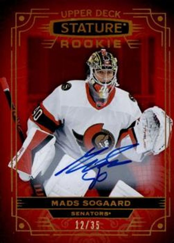 The Mads Sogaard 2022 Upper Deck Stature #169 Autographs - Red /35 Rookie card is 1 of 48 Mads Sogaard's card variations in the 2022 Upper Deck Stature set being tracked by Sports Card Investor, including Base /399, Green /99, Photo Variant /99, Red /75, and Photo Variant Green /66.