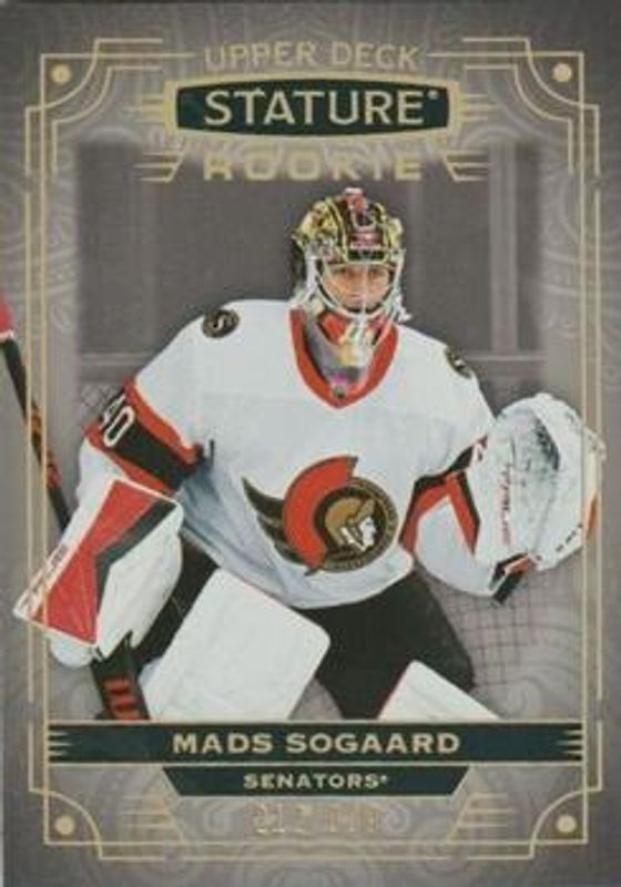 The Mads Sogaard 2022 Upper Deck Stature #169 Base /399 Rookie card is 1 of 48 Mads Sogaard's card variations in the 2022 Upper Deck Stature set being tracked by Sports Card Investor, including Green /99, Photo Variant /99, Red /75, Photo Variant Green /66, and Design Variant /65.