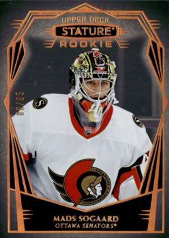 The Mads Sogaard 2022 Upper Deck Stature #169 Design Variant /65 Rookie card is 1 of 48 Mads Sogaard's card variations in the 2022 Upper Deck Stature set being tracked by Sports Card Investor, including Base /399, Green /99, Photo Variant /99, Red /75, and Photo Variant Green /66.