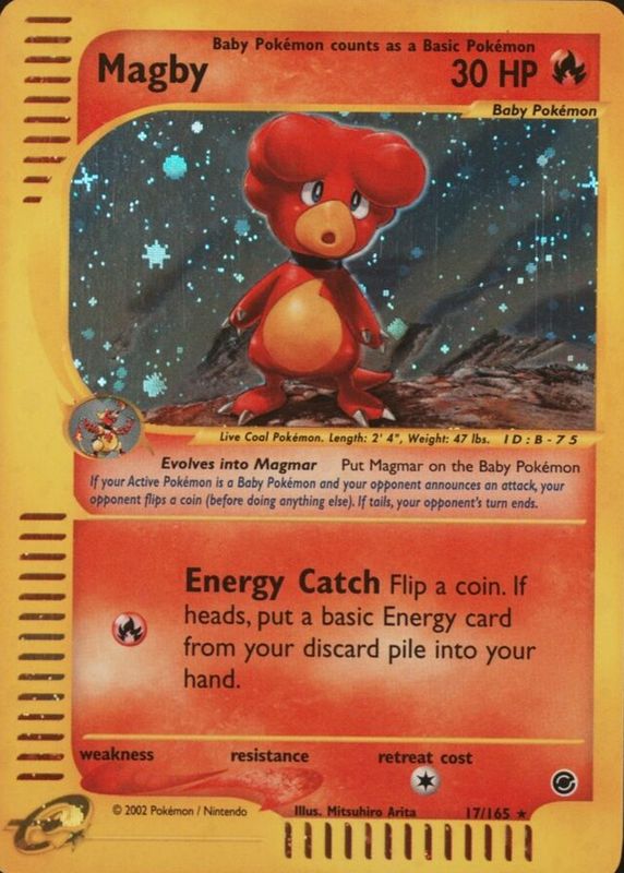 The Magby 2002 Expedition #017/165 Holo card in Raw TCG (Near Mint) condition has moved up $37.58 (+43.0%) in the last 30 days and was last sold for $125.00 .