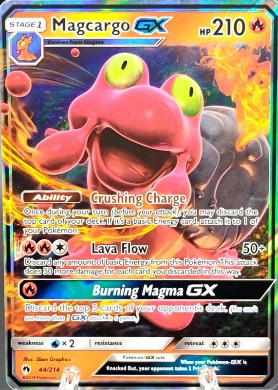 The Magcargo GX 2018 Sun & Moon: Lost Thunder #044/214 Holo card in Raw TCG (Near Mint) condition has moved down -$0.31 (-8.7%) in the last 30 days and was last sold for $3.25 .