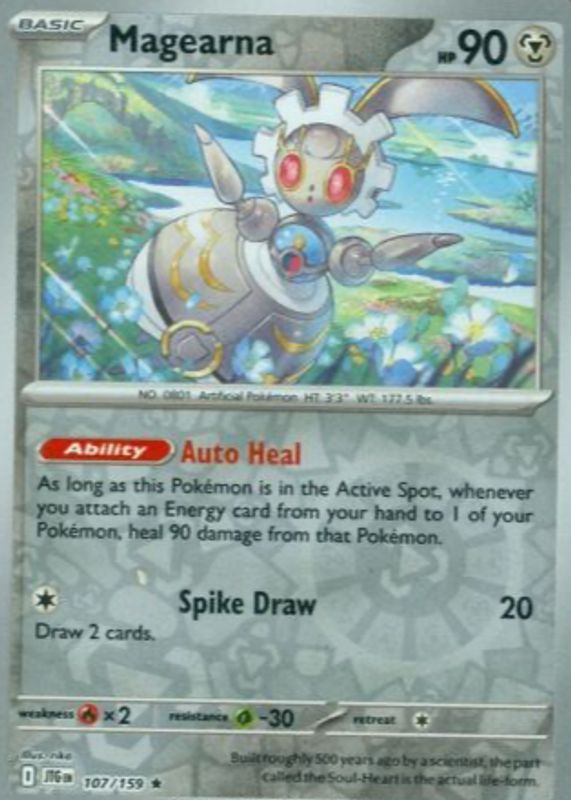 The Magearna 2025 Scarlet & Violet: Journey Together #107/159 Reverse Holo card in Raw TCG (Near Mint) condition has moved down -$0.19 (-11.2%) in the last 30 days and was last sold for $1.50 .