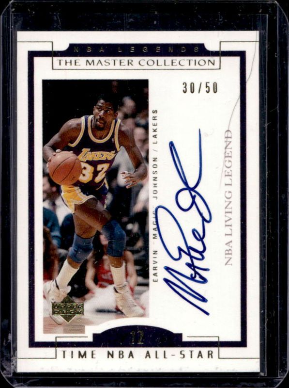 The Magic Johnson 2000 Upper Deck Legends Master Collection #EL2 Living Legends Autographs /50 card is 1 of 6 Magic Johnson's card variations in the 2000 Upper Deck Legends Master Collection set being tracked by Sports Card Investor, including #3 Base /200, #EL1 Living Legends Autographs /50, #EL3 Living Legends Autographs /50, #EL4 Living Legends Autographs /50, and #EJA Mystery Pack Inserts /1.