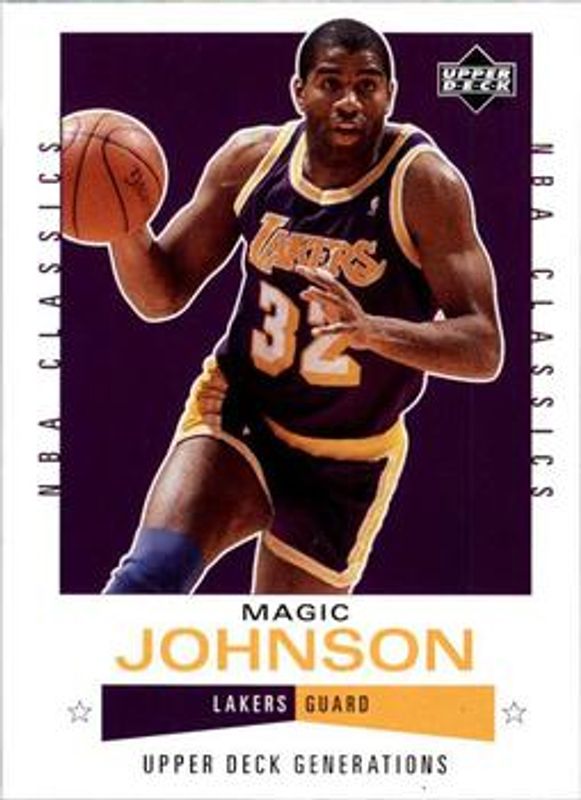 The Magic Johnson 2002 Upper Deck Generations #124 Base /999 card is 1 of 4 Magic Johnson's card variations in the 2002 Upper Deck Generations set being tracked by Sports Card Investor, including #MG2-A All Time Authentics, #MG-A All Time Authentics, and #MG-S Signatures Classics.