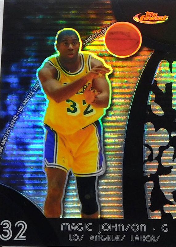 This card is 1 of 6 Magic Johnson's card variations in the 2007 Topps Finest set being tracked by Sports Card Investor, including Refractor, Blue Refractor /199, Green Refractor /149, Gold Refractor /25, and X-Fractor /15.
