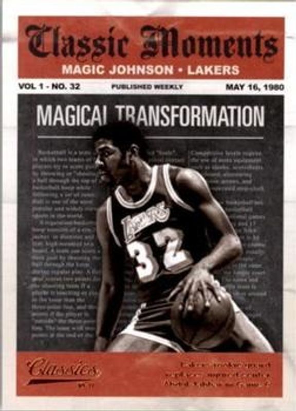 The Magic Johnson 2010 Classics #2 Classic Moments card is 1 of 20 Magic Johnson's card variations in the 2010 Classics set being tracked by Sports Card Investor, including Base /999, Timeless Tributes Silver /250, Timeless Tributes Gold /100, Timeless Tributes Platinum /25, and Timeless Tributes Black /1.