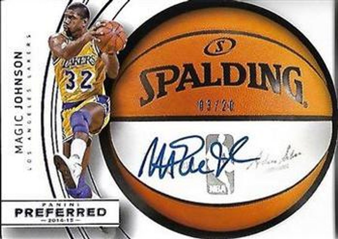 The Magic Johnson 2014 Preferred #92 Purple /20 card is 1 of 6 Magic Johnson's card variations in the 2014 Preferred set being tracked by Sports Card Investor, including #535 Base /50, #92 Base /50, #92 Gold /10, #92 Green /5, and #92 Platinum /1.