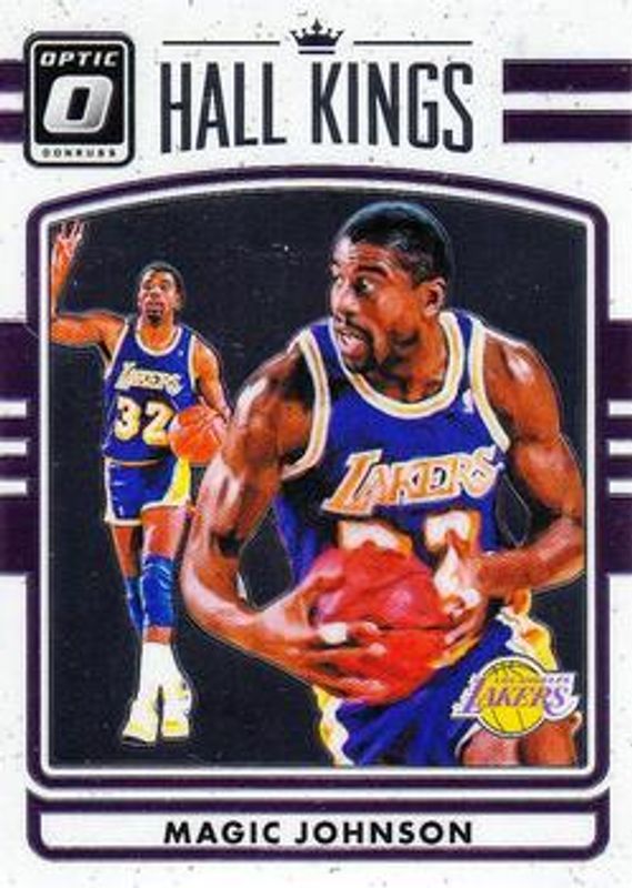 The Magic Johnson 2016 Optic #24 Hall Kings card is 1 of 28 Magic Johnson's card variations in the 2016 Optic set being tracked by Sports Card Investor, including All Stars, All Stars - Holo, Hall Kings - Holo, Hall Kings - Purple, and The Champ is Here.