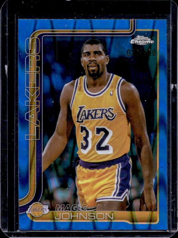 The Magic Johnson 2025 Topps Chrome #244 Blue RayWave Refractor /150 card is 1 of 142 Magic Johnson's card variations in the 2025 Topps Chrome set being tracked by Sports Card Investor, including Base, Basketball Refractor, Box Set Refractor, Lightboard Logo Refractor, and Negative Refractor.