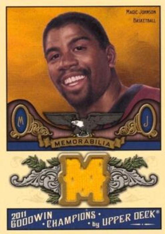 The Magic Johnson 2011 Upper Deck Goodwin Champions #M-JO Memorabilia card is 1 of 12 Magic Johnson's card variations in the 2011 Upper Deck Goodwin Champions set being tracked by Sports Card Investor, including Base, Mini, Mini Foil, Mini Black /49, and Mini Foil Magician Black /9.