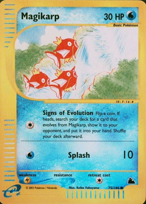 The Magikarp 2003 Skyridge #075/144 Reverse Holo card in Raw TCG (Near Mint) condition has not changed in price in the last 30 days and was last sold for $308.31 .