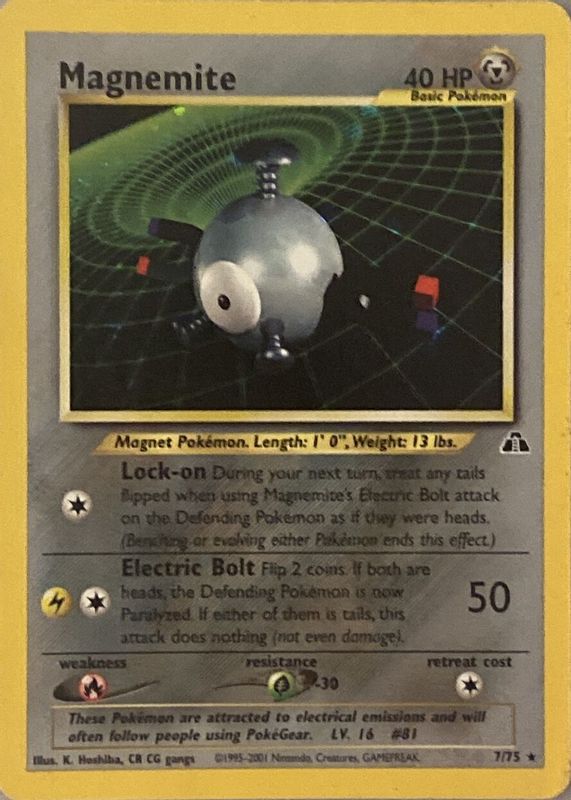 The Magnemite 2001 Neo Discovery #7/75 Holo card in Raw TCG (Near Mint) condition has moved down -$11.68 (-61.5%) in the last 30 days and was last sold for $7.31 .