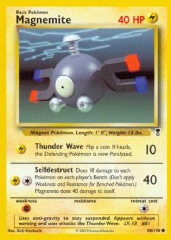 The Magnemite 2002 Legendary Collection #80 Base card in Raw TCG (Near Mint) condition has moved up $1.25 (+61.3%) in the last 30 days and was last sold for $3.29 .