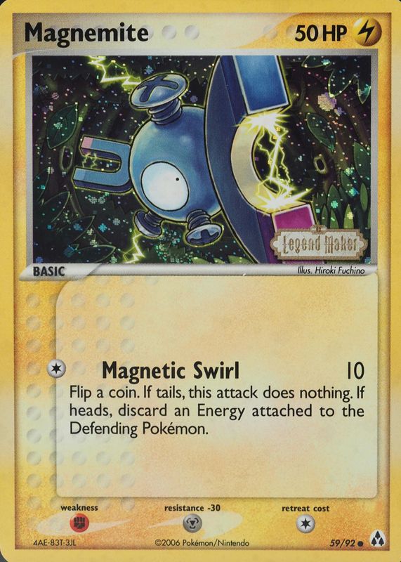The Magnemite 2006 EX: Legend Maker #59/92 Reverse Holo card in Raw TCG (Near Mint) condition has moved down -$3.74 (-19.7%) in the last 30 days and was last sold for $15.25 .