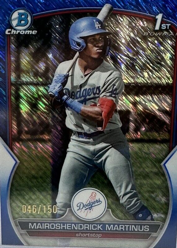 The Mairoshendrick Martinus 2023 Bowman #BCP-55 Chrome Prospects - Blue Shimmer Refractor /150 (1st) card in Raw condition has not changed in price in the last 30 days and was last sold for $4.99 .