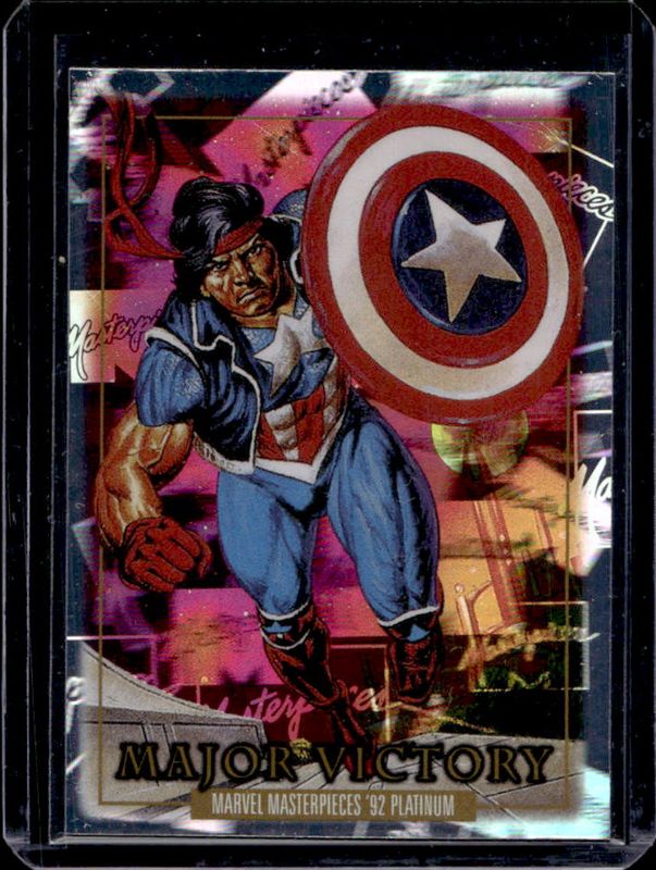 The Major Victory 2024 Upper Deck Marvel Masterpieces '92 Platinum #48 Holofoil card is 1 of 38 Major Victory's card variations in the 2024 Upper Deck Marvel Masterpieces '92 Platinum set being tracked by Sports Card Investor, including Base, Blue Traxx, Canvas, Clear Cut, and Emerald Surge.