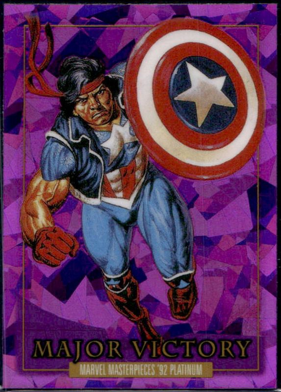 The Major Victory 2024 Upper Deck Marvel Masterpieces '92 Platinum #48 Purple Crystals card is 1 of 38 Major Victory's card variations in the 2024 Upper Deck Marvel Masterpieces '92 Platinum set being tracked by Sports Card Investor, including Base, Blue Traxx, Canvas, Clear Cut, and Emerald Surge.