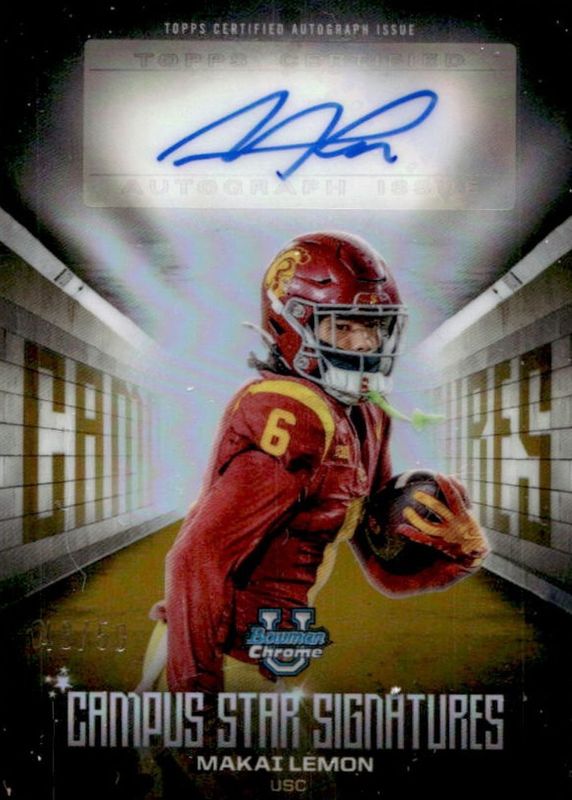 This card is 1 of 7 Makai Lemon's card variations in the 2025 Bowman Chrome University set being tracked by Sports Card Investor, including Campus Star Signatures, Campus Star Signatures - Green Refractor /99, Campus Star Signatures - Orange Refractor /25, Campus Star Signatures - Black Refractor /10, and Campus Star Signatures - Red Refractor /5.