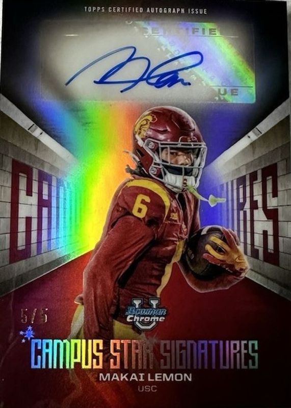 This card is 1 of 7 Makai Lemon's card variations in the 2025 Bowman Chrome University set being tracked by Sports Card Investor, including Campus Star Signatures, Campus Star Signatures - Green Refractor /99, Campus Star Signatures - Gold Refractor /50, Campus Star Signatures - Orange Refractor /25, and Campus Star Signatures - Black Refractor /10.