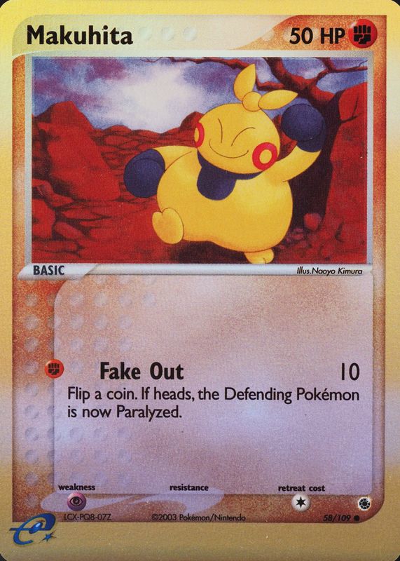 The Makuhita 2003 EX: Ruby & Sapphire #058/109 Reverse Holo card in Raw TCG (Near Mint) condition has not changed in price in the last 30 days and was last sold for $3.91 .