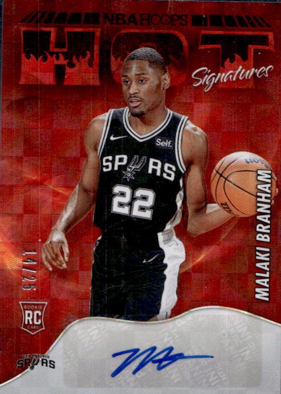 The Malaki Branham 2022 Hoops #HSR-MBH Hot Signatures Rookies - Red /25 card in Raw condition has not changed in price in the last 30 days and was last sold for $14.31 .