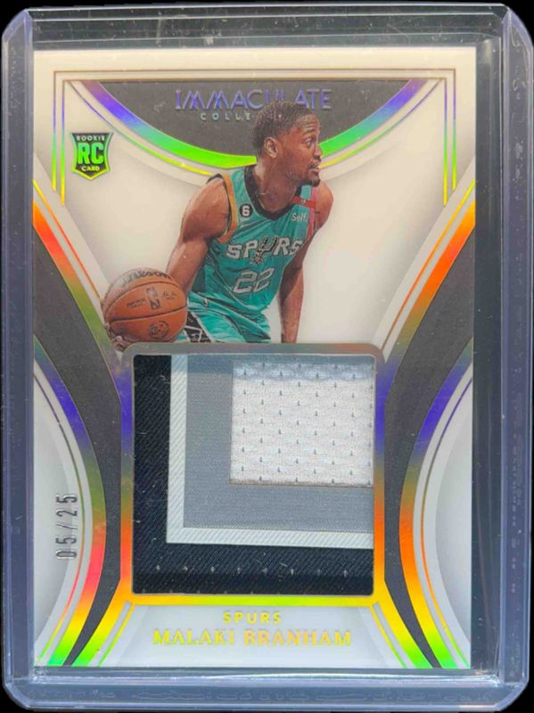 The Malaki Branham 2022 Immaculate #MM-MST Massive Memorabilia /25 Rookie card is 1 of 22 Malaki Branham's card variations in the 2022 Immaculate set being tracked by Sports Card Investor, including Base /99, Red /49, Gold /10, Rookie Patch Auto - Jersey Number (/22), and Remarkable Rookie Jerseys /99.