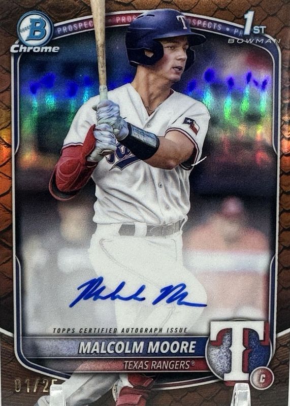 Best Prices Available For Sale of Malcolm Moore 2025 Bowman #CPA-MMO Chrome Prospect Auto - Reptilian Orange Refractor /25 (1st)