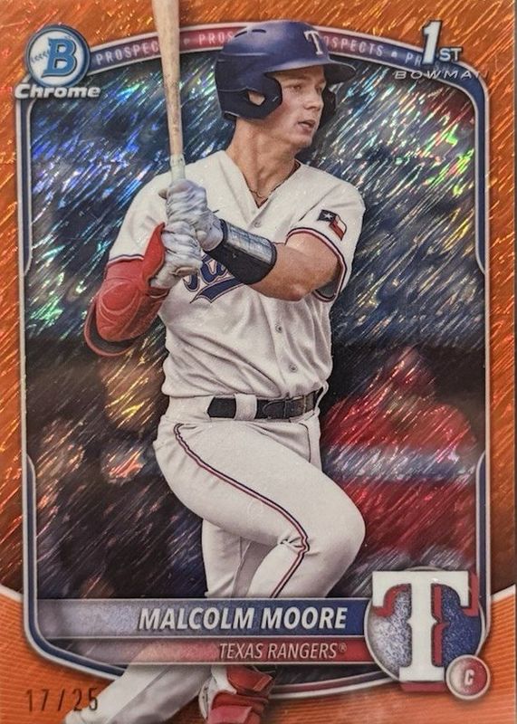 Recent Sales of Malcolm Moore 2025 Bowman #BCP-129 Chrome Prospects - Orange Shimmer Refractor /25 (1st) Raw