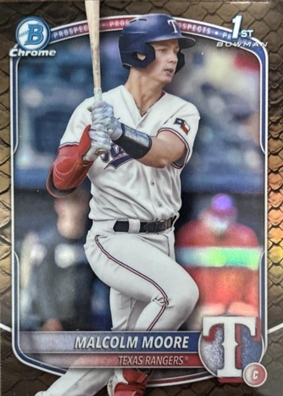 Best Prices Available For Sale of Malcolm Moore 2025 Bowman #BCP-129 Chrome Prospects - Reptilian Refractor (1st)